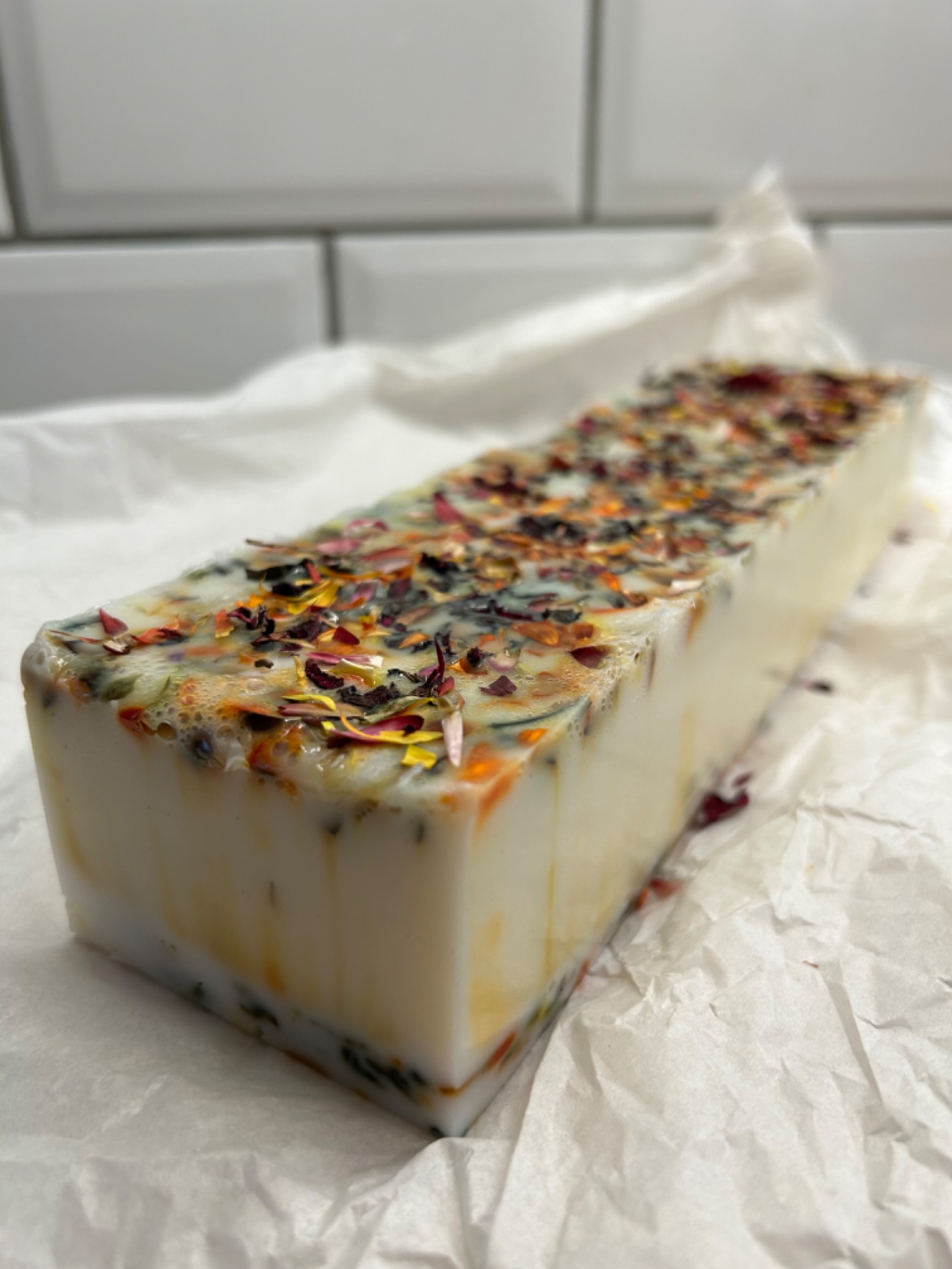 Denne såpen er med tørked blomster blader i regnbuens farger og har derfor fått navnet confetti.